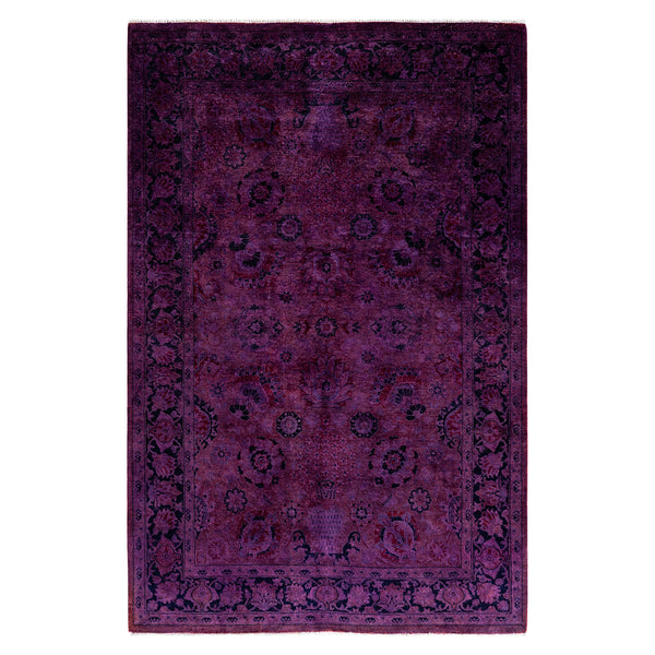 This Purple Overdyed Wool Rug - 4'3" x 6'4" epitomizes classic with a twist: a traditional pattern overdyed in a brilliant berry purple color. This hand-knotted rug is washed in a 100% natural botanical dye that reveals hidden nuances in the unique designs. This one-of-a-kind overdyed rug transcends trends, and its sturdy construction ensures that it’ll withstand years of heavy traffic. Finished with a traditional fringe.
