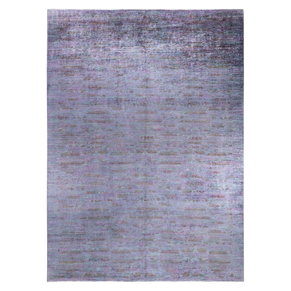 This large area rug features a purple overdyed design, measuring 10'1" by 13'9". Crafted from wool, this hand-knotted piece originates from India. The overdyed technique gives the rug a distinctive appearance with varied shades of purple and intentional fading, creating a distressed or vintage effect. The coloring includes a range of muted purple tones, from lighter lavender to deeper plum, often exhibiting an abrash (color variation) effect across its surface. This design choice contributes to a dynamic visual texture rather...