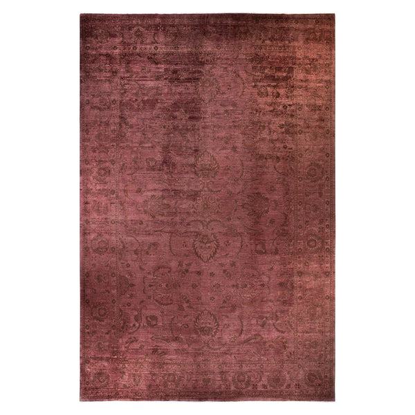 This large Red Overdyed Wool Rug measures 11'10" x 17'10", providing substantial coverage for expansive rooms. Crafted from durable wool and hand-knotted in India, this rug combines traditional construction with a contemporary aesthetic. The overdyed finish creates a unique visual effect, transforming a classic pattern with a deep, rich red hue that exhibits varied tones and a distressed appearance. This process allows the underlying traditional motifs to emerge subtly, adding character and depth without overpowering the space. The result is...