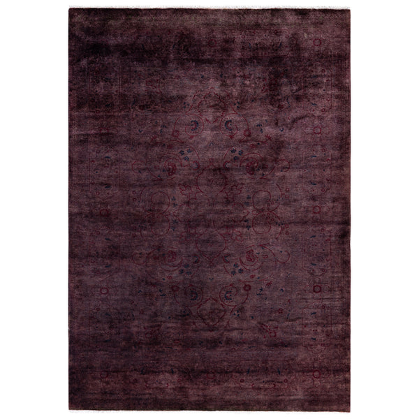 This Burgundy Overdyed Wool Rug - 4'8" x 6'9" showcases a deep burgundy hue with a subtle, faded pattern for a vintage look. Hand Knotted in Pakistan from 100% Wool, this plush rug features swirling designs and floral motifs, creating an elegant and understated appearance.