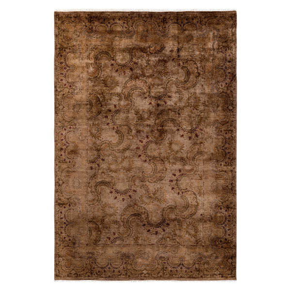 This hand-knotted overdyed wool rug measures 6'1" by 9'1" and features a rich brown color palette. Originating from India, this piece combines traditional craftsmanship with a distinctive, contemporary finish. Constructed from 100% natural wool, the rug offers both durability and a soft texture underfoot. The hand-knotted technique ensures a high-quality product, known for its resilience and ability to withstand regular use over time. The overdying process imparts a layered brown hue, creating a distressed or vintage appearance. Beneath this rich...