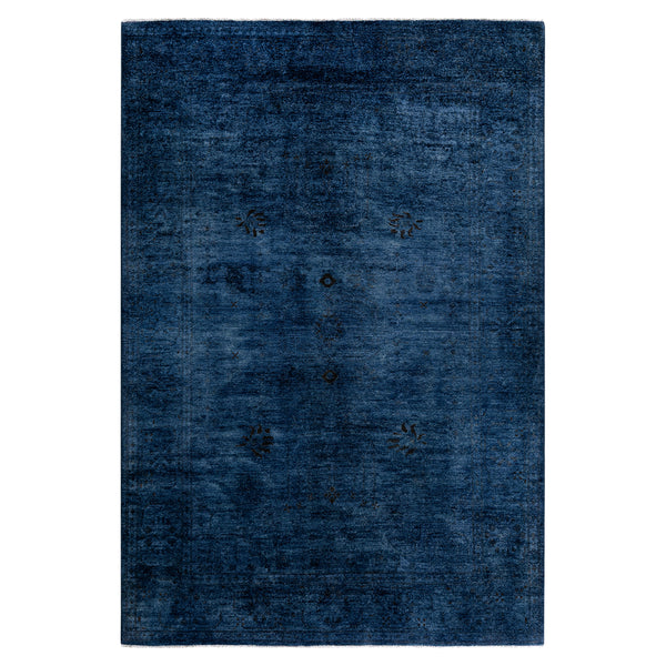 This overdyed rug features a deep blue color and measures 6 feet 3 inches by 9 feet 4 inches. Crafted from wool, this hand-knotted rug originates from India, reflecting traditional craftsmanship. The overdying process gives the rug its distinct appearance. Underlying patterns are visible through the saturated blue dye, creating a faded, antique aesthetic. This technique results in subtle variations in color and texture across the surface, adding visual depth and character. The primary color is a rich, indigo blue,...