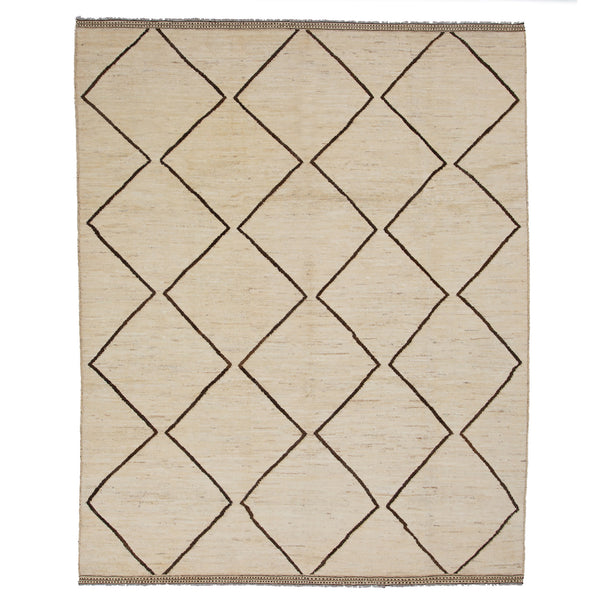 This Moroccan Style Berber Rug features natural earth tones with a balanced diamond pattern serving as a modern retelling of traditional Moroccan rugs. The Tarzi Rug Collection features Moroccan Berber-style rugs hand-knotted from durable wool that is hand-dyed from natural pigments. Originating from tribal designs in Morocco's Atlas Mountains, this one-of-a-kind rug reimagines large and oversized Moroccan rugs in modern sizes. A beautiful display of art and culture for the contemporary home.