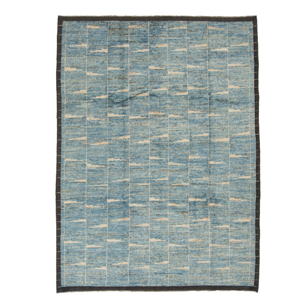 This Moroccan Style Berber Rug features natural blue and brown tones with a neutral geometric pattern serving as a modern retelling of traditional Moroccan rugs. The Tarzi Rug Collection features Moroccan Berber-style rugs hand-knotted from durable wool that is hand-dyed from natural pigments. Originating from tribal designs in Morocco's Atlas Mountains, this one-of-a-kind rug reimagines large and oversized Moroccan rugs in modern sizes. A beautiful display of art and culture for the contemporary home.
