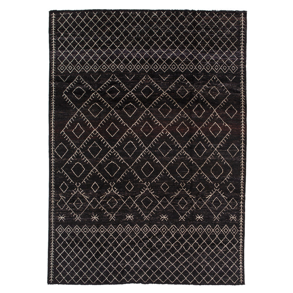 This Moroccan Style Berber Rug features a dramatic black and white color palette with a geometric tribal pattern serving as a modern retelling of traditional Moroccan rugs. The Tarzi Rug Collection features Moroccan Berber-style rugs hand-knotted from durable wool that is hand-dyed from natural pigments. Originating from tribal designs in Morocco's Atlas Mountains, this one-of-a-kind rug reimagines large and oversized Moroccan rugs in modern sizes. A beautiful display of art and culture for the contemporary home.