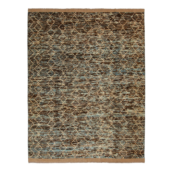 This contemporary hand-knotted wool rug measures 9 feet 2 inches by 11 feet 3 inches, offering a substantial focal point for a room. The design features a multicolored palette primarily composed of rich dark browns and varied shades of blue, creating an abstract and textured base. Overlaid on this backdrop is a geometric diamond lattice pattern in a lighter, contrasting tone, providing visual structure and depth. Crafted from durable wool, this rug is hand-knotted, a traditional construction method that ensures...