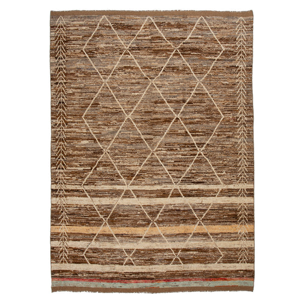 This large contemporary area rug measures 9 feet 8 inches by 12 feet 10 inches, making it suitable for spacious living areas. Hand-knotted from premium wool, this durable piece originates from Central Asia, reflecting traditional craftsmanship combined with a modern aesthetic. The rug features a dominant brown color palette, incorporating various shades of brown and beige to create a rich, textured field. A prominent diamond lattice pattern in a lighter, cream tone extends across the central area, providing visual structure....