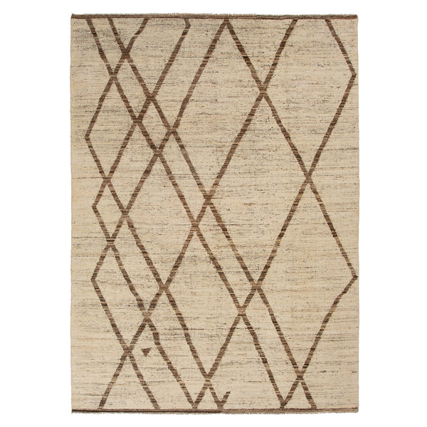 This contemporary hand-knotted wool rug measures 9'8'' x 12'11'' and originates from Central Asia. It features a modern design, characterized by a distinct brown geometric pattern of intersecting diamonds set against an off-white, textured background. Constructed from high-quality wool, this large area rug offers durability, natural softness, and insulation. The hand-knotted technique ensures a sturdy and long-lasting piece, showcasing meticulous craftsmanship. Each knot contributes to the rug's unique character and robust build, making it suitable for various living spaces. The...