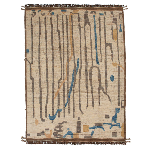 This Moroccan Style Berber Rug features natural earth tones with a colorful tribal pattern serving as a modern retelling of traditional Moroccan rugs. The Tarzi Rug Collection features Moroccan Berber-style rugs hand-knotted from durable wool that is hand-dyed from natural pigments. Originating from tribal designs in Morocco's Atlas Mountains, this one-of-a-kind rug reimagines large and oversized Moroccan rugs in modern sizes. A beautiful display of art and culture for the contemporary home.