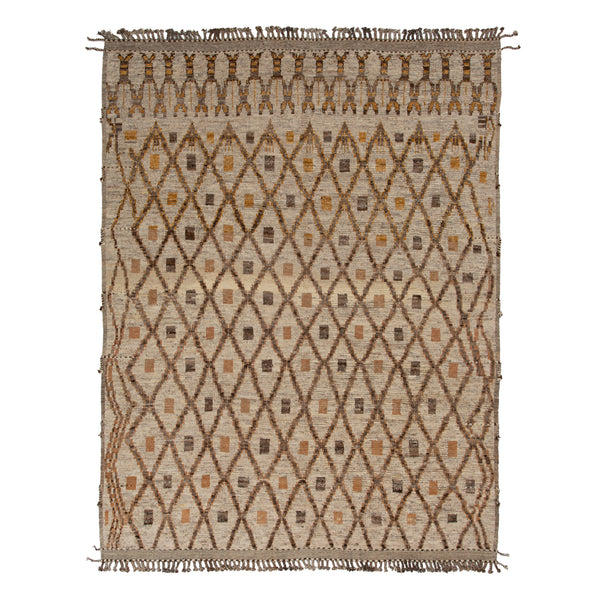 This Moroccan Style Berber Rug features neutral earth tones with a balanced tribal pattern serving as a modern retelling of traditional Moroccan rugs. The Tarzi Rug Collection features Moroccan Berber-style rugs hand-knotted from durable wool that is hand-dyed from natural pigments. Originating from tribal designs in Morocco's Atlas Mountains, this one-of-a-kind rug reimagines large and oversized Moroccan rugs in modern sizes. A beautiful display of art and culture for the contemporary home.