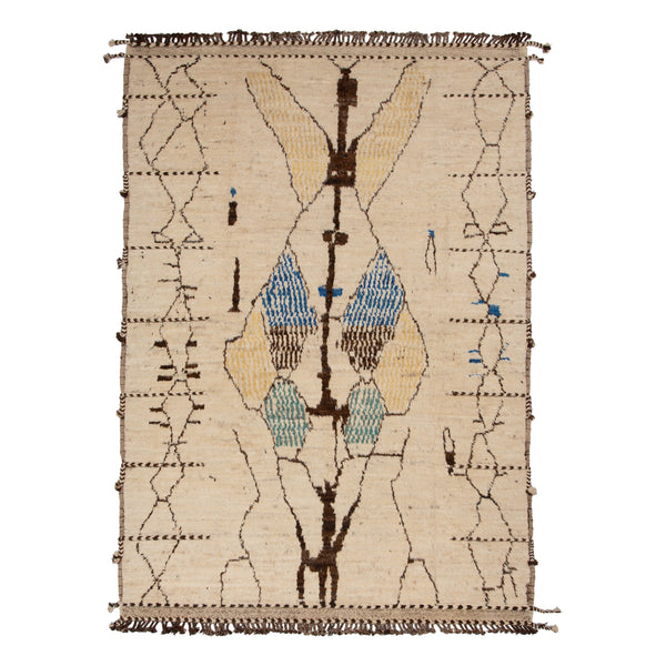 This contemporary hand-knotted wool rug, measuring 9 feet 5 inches by 13 feet 7 inches, provides a substantial and stylish foundation for various living spaces. Crafted from natural wool, this area rug combines the durability and resilience of its material with a modern design aesthetic. The rug originates from Central Asia, reflecting a tradition of quality craftsmanship. The design features a predominantly cream or off-white field, providing a neutral base. A prominent, abstract central motif incorporates shades of brown, yellow,...