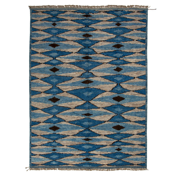 This Moroccan Style Berber Rug features bright blue and earth tones with an abstract argyle pattern serving as a modern retelling of traditional Moroccan rugs. The Tarzi Rug Collection features Moroccan Berber-style rugs hand-knotted from durable wool that is hand-dyed from natural pigments. Originating from tribal designs in Morocco's Atlas Mountains, this one-of-a-kind rug reimagines large and oversized Moroccan rugs in modern sizes. A beautiful display of art and culture for the contemporary home.