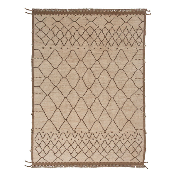 This contemporary rug, measuring 10'4'' x 14'3'', provides a substantial floor covering suitable for various interior designs. Constructed from 100% wool and hand-knotted, it offers both durability and a comfortable texture. The rug features a natural, light brown base accented with contrasting darker brown geometric patterns. A central design of interlocking diamonds creates a structured visual, complemented by horizontal bands detailing 'X' shapes and small dots. This pattern gives the rug a modern aesthetic with subtle traditional undertones. The edges...
