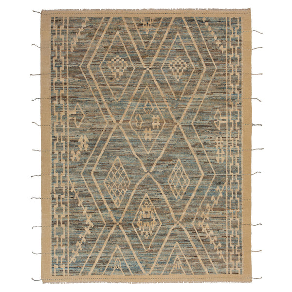 This Moroccan Style Berber Rug features natural blue and brown tones with a beige tribal pattern serving as a modern retelling of traditional Moroccan rugs. The Tarzi Rug Collection features Moroccan Berber-style rugs hand-knotted from durable wool that is hand-dyed from natural pigments. Originating from tribal designs in Morocco's Atlas Mountains, this one-of-a-kind rug reimagines large and oversized Moroccan rugs in modern sizes. A beautiful display of art and culture for the contemporary home.