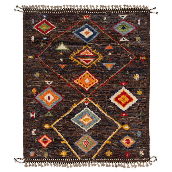 This Multicolored Modern Wool Rug - 8'6'' x 9'9'' features natural earth tones with a colorful tribal pattern serving as a modern retelling of traditional Moroccan rugs. The Tarzi Rug Collection features Moroccan Berber-style rugs hand-knotted from durable wool that is hand-dyed from natural pigments. Originating from tribal designs in Morocco's Atlas Mountains, this one-of-a-kind rug reimagines large and oversized Moroccan rugs in modern sizes. A beautiful display of art and culture for the contemporary home.