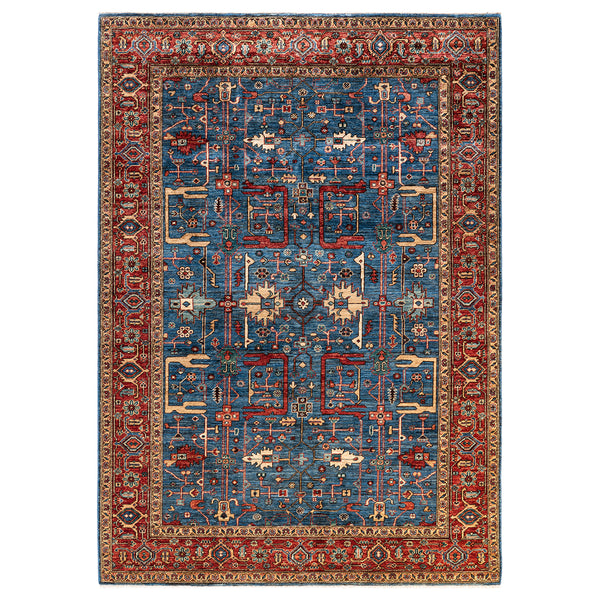 This Blue Traditional Serapi Wool Rug is a stunning hand-woven piece from Pakistan, measuring 6'1" x 8'8". Featuring a deep blue background, this traditional rug showcases intricate designs in contrasting colors like red, cream, and tan. With a symmetrical pattern of geometrical and floral elements, this high-quality wool rug exudes elegance and craftsmanship. A perfect addition to any space.