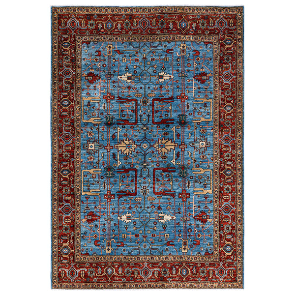 This Blue Traditional Serapi Wool rug from Pakistan is a masterpiece of intricate design. Featuring a rich blue field with geometric and botanical motifs in red, cream, tan, and navy, this hand-knotted rug exudes quality craftsmanship. The ornate border frames the central design area, creating a visually striking piece for any home.