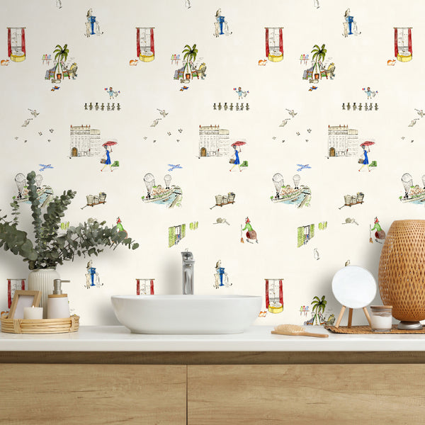 Adorn your walls with Yuki Osada’s elevated whimsy. Featuring cartoon-inspired vignettes of Paris’s human and animal inhabitants, Paris Cats is infused with childlike charm. Try it in a children’s bedroom, walk-in closet, or powder room. Yuki Osada is a celebrated CAD designer, graphic artist, and illustrator known for her playful Parisian aesthetic.