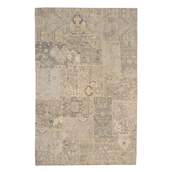 This Grey Patchwork Wool Rug - 6' x 9' is a beautifully crafted patchwork rug from India. Hand woven from wool, it features intricate patterns in soft tones of beige, grey, and blue. The mix of floral and geometric designs creates a richly textured vintage look, showcasing quality and elegance.