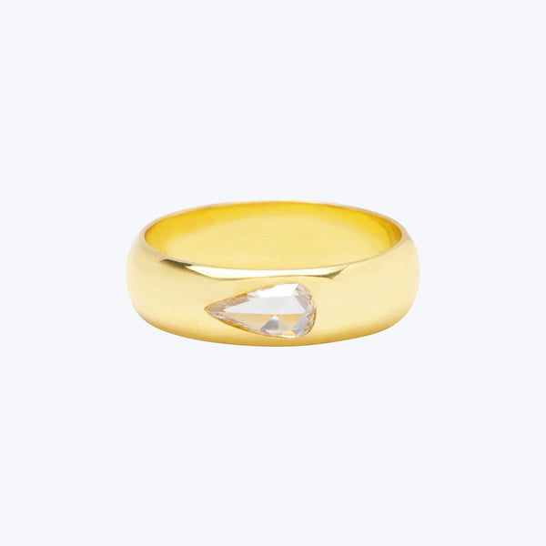 This Pear Rose Cut Gypsy Band is a unique statement ring or engagement ring for that special someone. A pear rose cut diamond (.48ct) sparkles in this rounded 18k gold band. The band measures approximately 5mm wide.