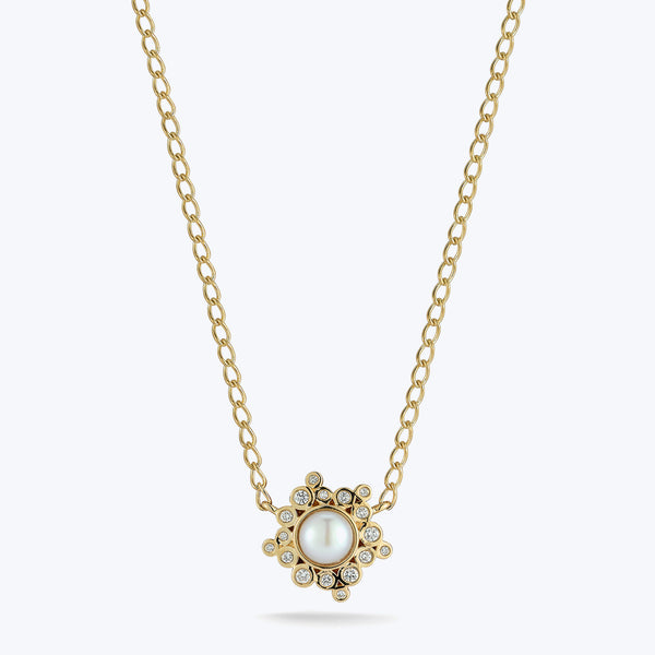 A gleaming pearl is surrounded by effervescent diamond bubbles with an 18k yellow gold setting in this signature Pearl Bubble Necklace. Renna Jewelry showcases the highest quality pieces for the modern woman — nostalgically chic and eclectically elegant. Adjustable 16-17". Diamonds .17 tcw.
