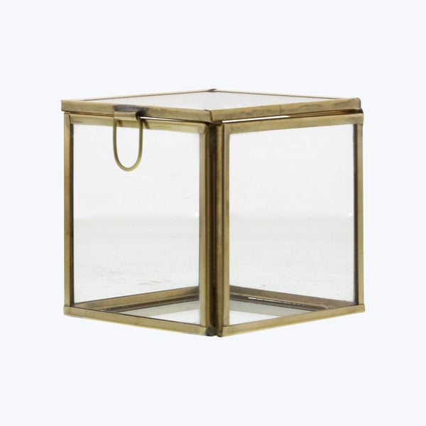 Introducing the Pierre Demi Leaded Glass Box in Brass. This vintage-inspired box features a geometric structure with paneled glass sides framed by brass. The metal hanging loop adds to its unique charm. Made in the USA, this high quality and visually striking piece will enhance any space.