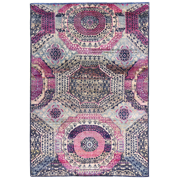 This Pink Alchemy Transitional Silk Rug is a stunning hand-knotted masterpiece from India. Featuring vibrant pink, navy blue, and cream hues in a complex geometric pattern, this 5'1" x 7'5" rug showcases intricate floral and symmetrical elements. The silk material adds a luxurious texture, making this rug a statement piece for any space.