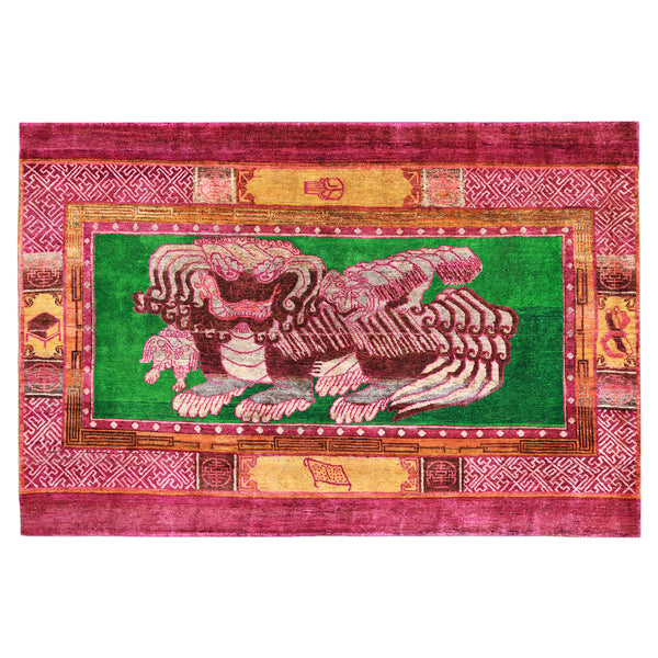 This Pink Alchemy Transitional Silk Rug is a stunning 6'1" x 4'2" piece hand-knotted in India. Featuring a vibrant central dragon design on a bright green background, surrounded by a border in shades of pink, orange, and yellow with intricate patterns. Made of luxurious silk, this rug exudes traditional elegance and quality craftsmanship.