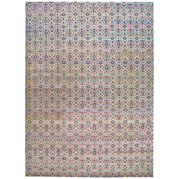 This large area rug, from the Alchemy Rug Collection, measures 15 feet 10 inches by 21 feet 4 inches. It is hand-knotted in India, featuring a blend of silk and wool fibers. The rug displays a multicolored palette across its surface. Its design consists of a dense, repeating pattern of small, intricate motifs set against a light-toned background. The individual motifs incorporate various hues, including shades of blue, purple, red, and green, contributing to its transitional style. This design approach...