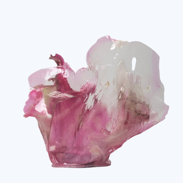 Striking in hue and form, the Pink Angel Bioplastic Vessel by Caroline Zimbalist brings avant-garde beauty to daring spaces. This extraordinary one-of-a-kind piece is hand-cooked and sculpted by Caroline using her proprietary recipe of biodegradable and natural materials. Each vessel includes a stainless steel base for added weight and stability, along with a removable borosilicate glass insert, allowing it to safely hold water and fresh flowers. Handcrafted in the USA.