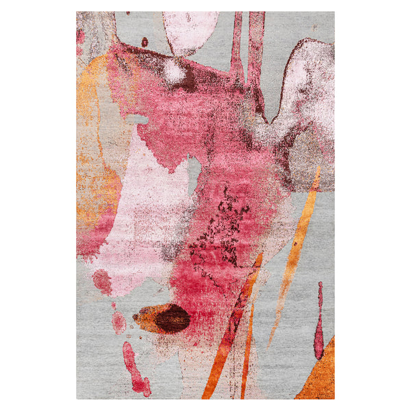 This 6' x 9' contemporary area rug combines artistic design with luxurious materials. Handcrafted in India, this piece is made from silk, offering a refined texture and a subtle sheen. The rug features an abstract pattern on a light grey background. Dynamic splashes and streaks of various pinks, including fuchsia and rose, are layered with accents of deep crimson, rust, and warm gold. This design creates a visually engaging focal point for modern interiors. Measuring 6 feet by 9 feet,...