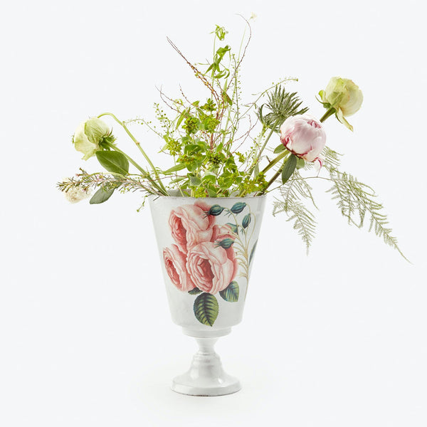 Handmade on the Rue St. Honore in Paris, these 18th-century inspired ceramics are crafted in a traditional pottery style passed down from generations. Hand molded from black terracotta, each piece is finished in a milky-white glaze that highlights the unique character of the clay, celebrating its imperfections and ensuring that no two pieces are exactly alike. Emblazoned with the iconic work of decoupage artist John Derian, these ceramics showcase the visually stimulating beauty of nature through colorful imagery.