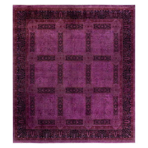 This overdyed wool rug, measuring 10'3" x 11'3", combines traditional craftsmanship with a contemporary aesthetic. Hand-knotted by skilled artisans in Pakistan, this rug offers durable construction and a distinct visual appeal. The rug features a vibrant pink color, a result of the specialized overdying process. This technique applies a new dye layer to an existing rug, saturating the wool fibers while allowing the original patterns to emerge through the updated hue. The design includes a central field with a grid...