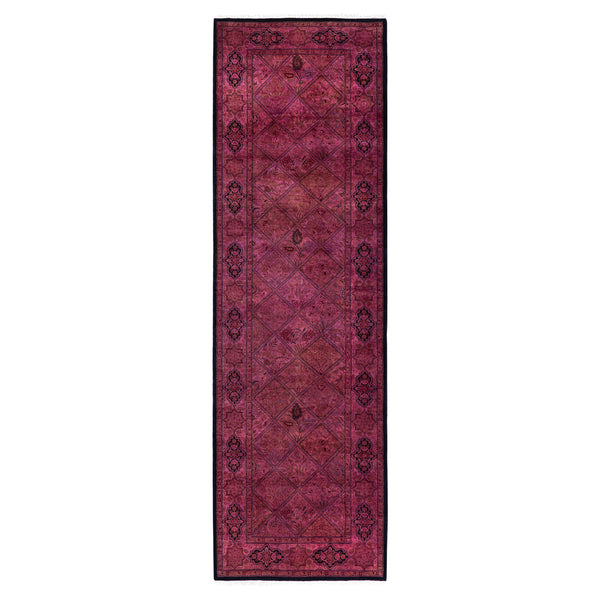 This Pink Overdyed Wool Runner measures 2'8" x 8'8", offering a distinctive style for your home. It is hand-knotted from durable wool and originates from Pakistan. The overdyed process gives this runner its unique visual character. Traditional wool rugs are revitalized by being dyed a new, rich pink color. This technique allows the original intricate patterns and designs to subtly show through the new hue, creating a layered effect. The result is a modern rug that retains the depth and...