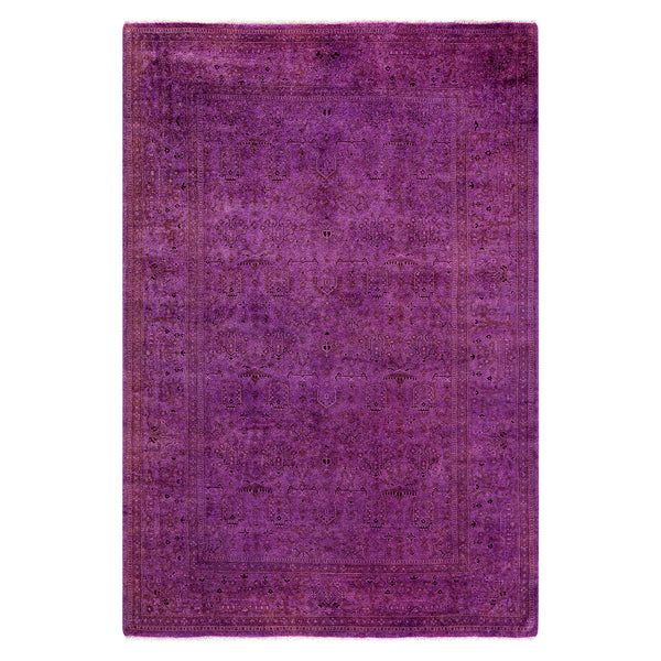 This Purple Overdyed Wool Rug, measuring 4'1" x 6', is a handcrafted piece designed to add color and texture to any space. As an overdyed rug, it features a traditional wool foundation that has been recolored with a deep, uniform purple hue. This process allows the original pattern of the rug to remain subtly visible beneath the new color, adding depth and a unique visual effect. The rug is constructed from wool using a hand-knotted technique, a traditional method that...