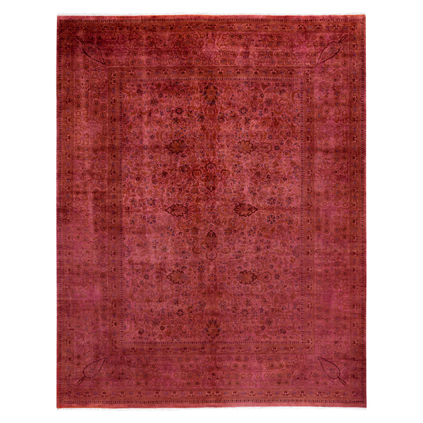 This Pink Overdyed Wool Rug - 8'3" x 10'3" is a classic Persian-style beauty from Pakistan. Hand Knotted with rich red hues and intricate floral and geometric motifs, this Overdyed rug exudes elegance. Made of high-quality wool, it boasts a luxurious texture and timeless appeal.