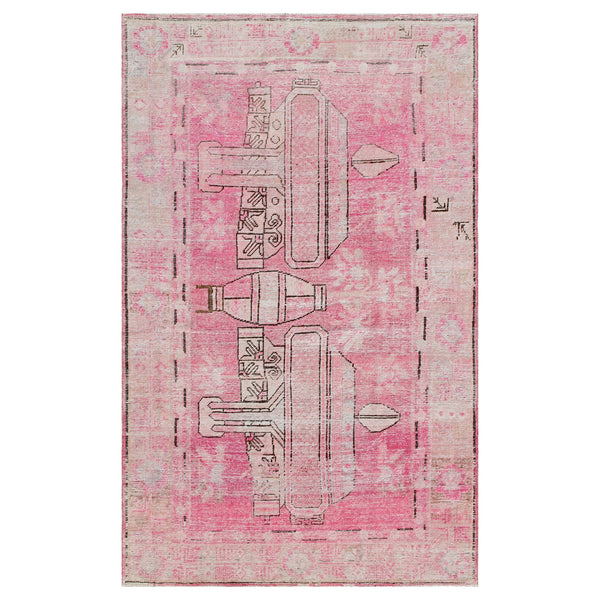 This traditional Pink Vintage Wool Cotton Blend Rug measures 4'5" x 7'3", making it a distinctive addition to various interior spaces. Hand-knotted by artisans in Uzbekistan, this rug exemplifies skilled craftsmanship and a classic aesthetic. Constructed from a durable wool and cotton blend, this rug offers both softness underfoot and resistance to everyday wear. The material composition ensures a comfortable texture while maintaining the integrity required for long-term use. Its primary pink color features a distressed, faded finish, contributing to...
