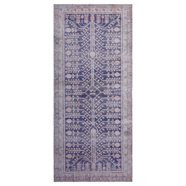 This traditional runner, originating from Uzbekistan, features a hand-knotted construction crafted from a wool cotton blend. Measuring 4'6" x 10'8", it offers a distinct vintage aesthetic suitable for various interior spaces. The design showcases a central stylized pattern, primarily in faded purple and deep blue hues, accented by softer pink details. This intricate motif is bordered by a complementary frame, contributing to its classic traditional style. The color palette provides a subtly distressed look. The blend of wool and cotton...