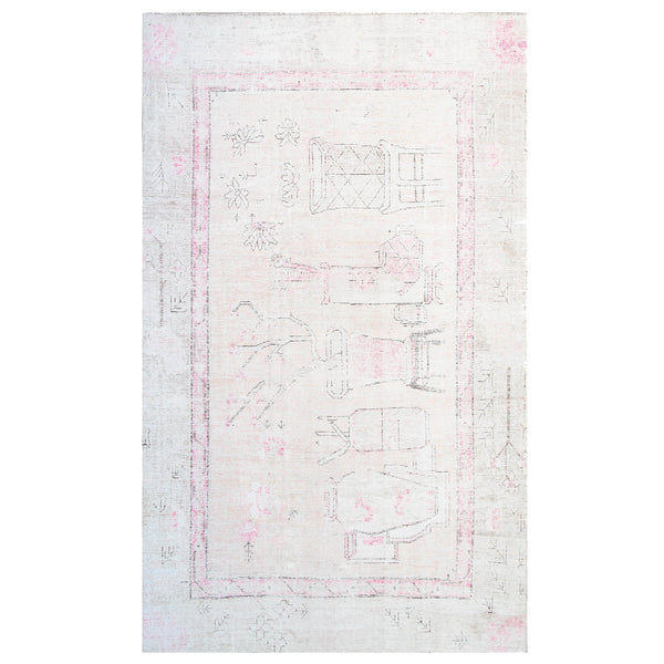 This traditional hand-knotted rug measures 5'1" x 8'1", offering a vintage aesthetic suitable for various interior settings. Its design features a predominantly off-white or light neutral field, complemented by a faded pink border and subtle, distressed traditional motifs in pink. The overall appearance presents a gently aged look, characteristic of vintage pieces. Crafted in Uzbekistan, this rug is constructed from a durable wool and cotton blend. The hand-knotted technique ensures a sturdy and long-lasting foundation, providing both resilience and a...