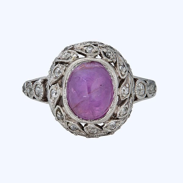Incredibly elegant and eye-catching, this Vintage Platinum Pink Star Sapphire Ring features a central dome stone accented with a diamond and platinum leaf frame for delicate decoration. This Art Decor dome cocktail ring is incredibly desirable with its large pink star sapphire. To learn more about this piece of vintage jewelry, please book an in-person or virtual appointment with our jewelry specialist.
