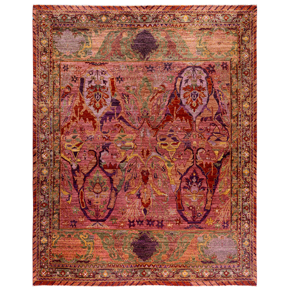 This Pink Soluna Traditional Wool Rug is a stunning 8'2" x 10'1" rug from Pakistan. Hand Knotted from 100% Wool, it features a colorful, ornate pattern with floral and abstract motifs in shades of pink, orange, purple, and green. The detailed geometric and floral border adds to its rich and vibrant appearance, reflecting a traditional or antique style. Quality craftsmanship and luxurious texture make this rug a high-end addition to any home.