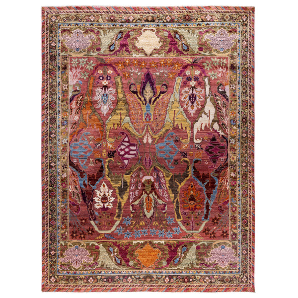 This Purple Soluna Traditional Wool Rug is a stunning piece hand-knotted in Pakistan. Its vibrant colors of red, purple, blue, and orange create an intricate floral and geometric pattern. Made of 100% wool, this traditional rug is of the highest quality, with a detailed border adding to its ornate appearance. A true masterpiece for any home.