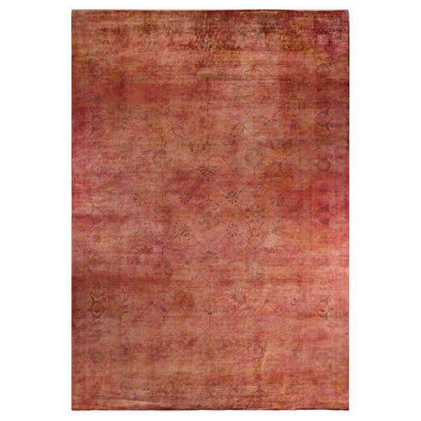 This Orange/Pink Overdyed Transitional Wool Rug - 10'1" x 14'1" epitomizes classic rug designs with a twist: a traditional pattern is overdyed in a mix of pink, orange, and red tones. This hand-knotted area rug is washed in a 100% natural botanical dye that reveals hidden nuances in the unique designs, a process unique to the Color Reform Collection exclusively at abc carpet & home. This one-of-a-kind overdyed rug transcends trends, and its sturdy construction ensures that it’ll withstand years...