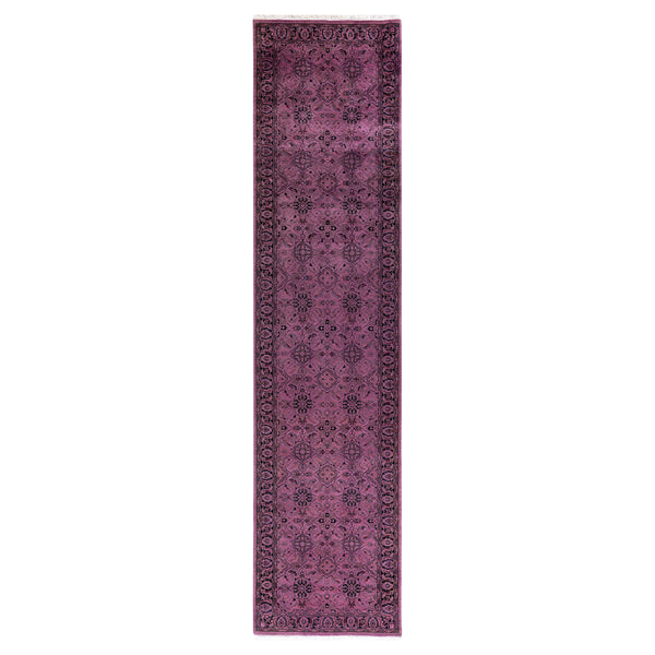 This Pink Overdyed Transitional Wool Runner - 3' x 13'1" epitomizes classic rug designs with a twist: a traditional pattern is overdyed in a brilliant pink color. This hand-knotted runner rug is washed in a 100% natural botanical dye that reveals hidden nuances in the unique designs. This one-of-a-kind overdyed runner transcends trends, and its sturdy construction ensures that it’ll withstand years of heavy traffic. This pink runner is finished with a traditional fringe for an extra touch of texture.