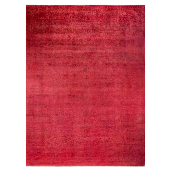 This large area rug features an overdyed design in a dominant red hue, measuring 8'10" by 12'2". It is constructed from wool and hand-knotted, a traditional method known for durability and unique craftsmanship. The rug originates from Pakistan. The overdying process gives the rug a distinctive appearance. An existing traditional pattern, visible in subtle detail beneath the vibrant red, has been treated with a new dye bath. This results in a varied coloration across the surface, with areas of deeper...