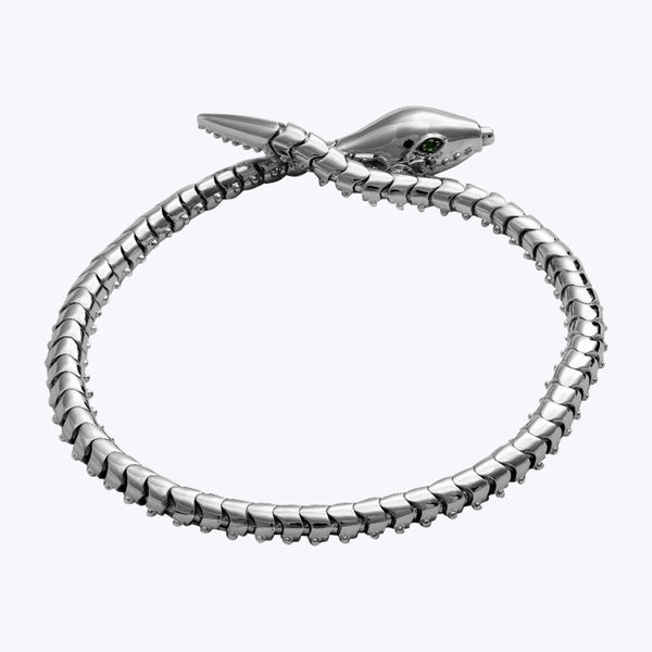 The White Gold Serpent Bracelet features a scale-like bracelet chain with a serpent head and 2 Tsavorite stones as eyes.