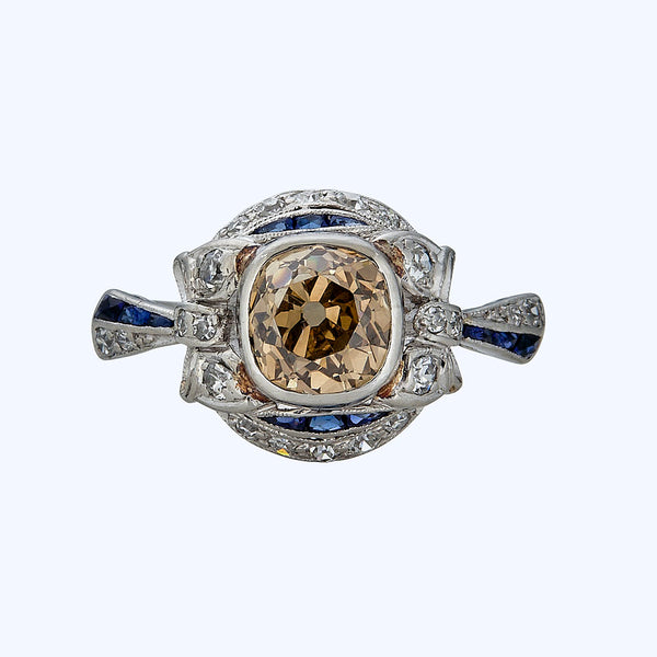 This Art Deco Platinum Diamond and Sapphire Ring showcases a large, cushion-cut center stone, complemented by a halo of diamonds. The milgrain detailing and blue sapphire accents add a touch of elegance. Crafted from high-quality platinum, this ring exudes sophistication. Size 6.5.