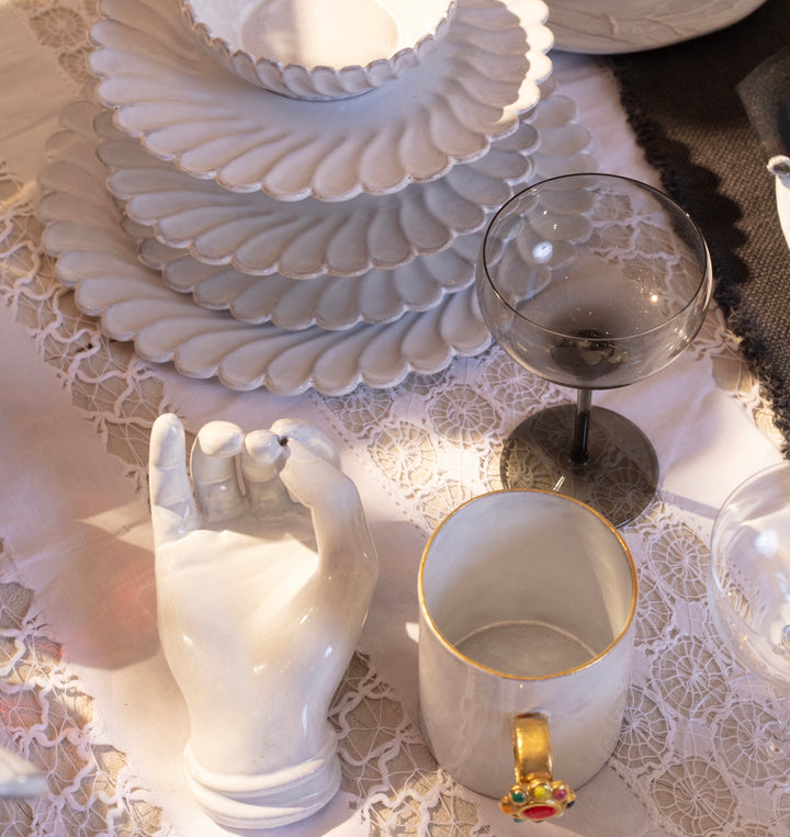 Exclusively at ABC, this Jan Burtz creation is touched by a delicate gold border that lovingly outlines its natural and irregular forms. Made by hand from creamy porcelain and homemade glazes, these pieces bring us back to the basics, accentuating the fluidity and grace of hand-formed wares. Made in Jan Burtz's Connecticut studio, no two pieces are alike, though all are food, dishwasher, and microwave safe.