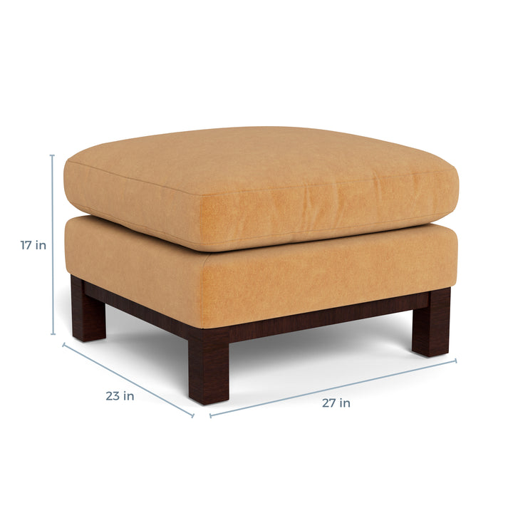Measuring 27 inches in width, 17 inches in height, and 23 inches in depth, this ottoman provides ample space to be used as a footrest, extra seating, or part of a modular configuration of other pieces from the Prescott Collection.