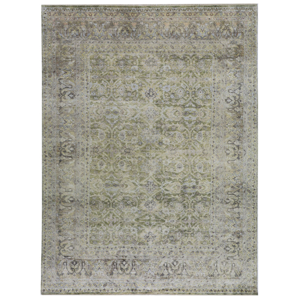The Grey Alchemy Transitional Silk Rug measures 8'1" x 11', making it a suitable large area rug for various spaces. This piece belongs to the Alchemy Rug Collection and is hand-knotted from silk in India. The rug features a transitional design with a distressed pattern that blends traditional motifs with a softened, aged aesthetic. Its color palette is predominantly grey, enriched with subtle variations of muted green and cream. This multi-toned approach provides depth and visual interest, allowing the rug...